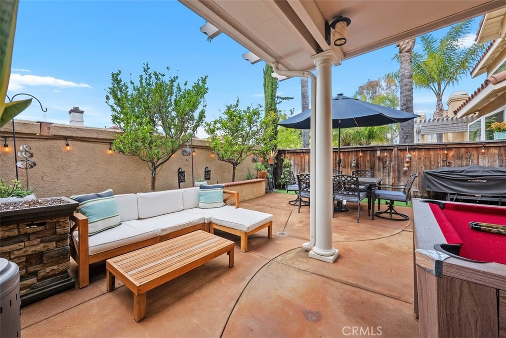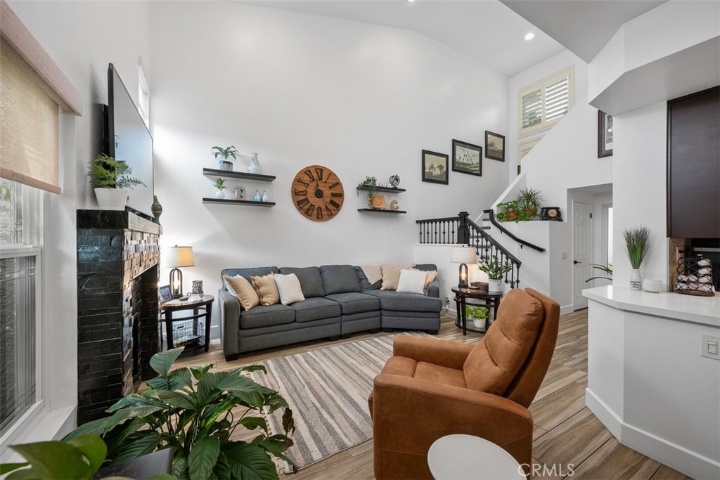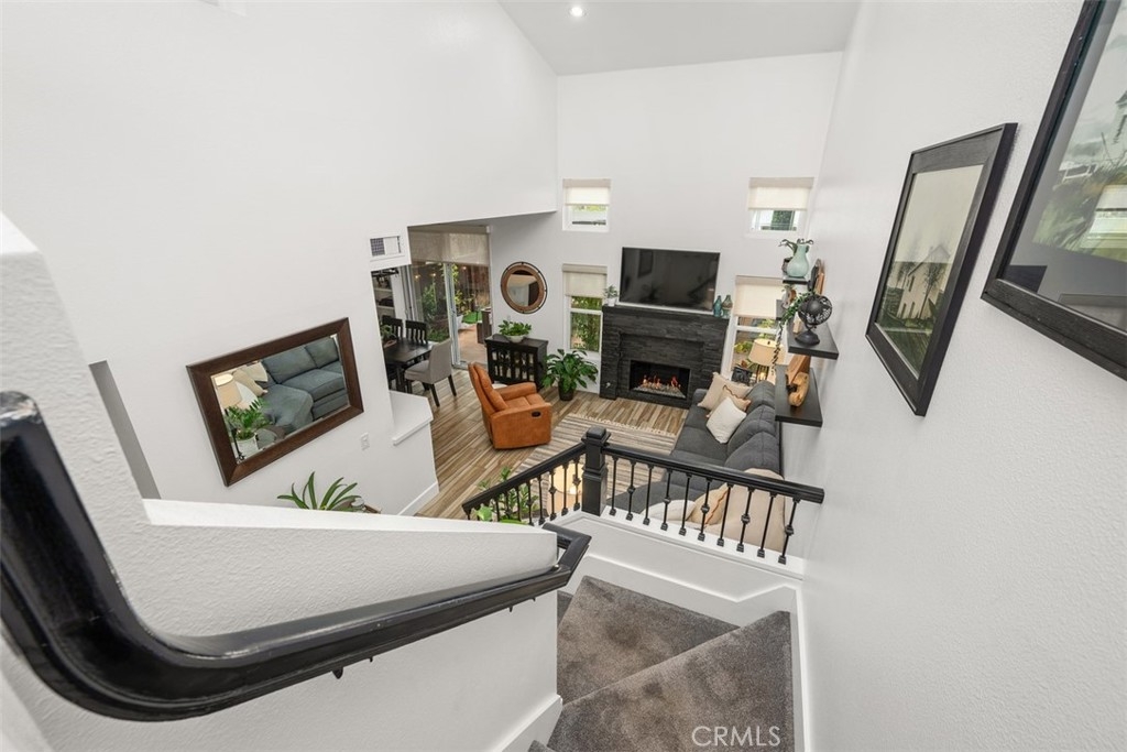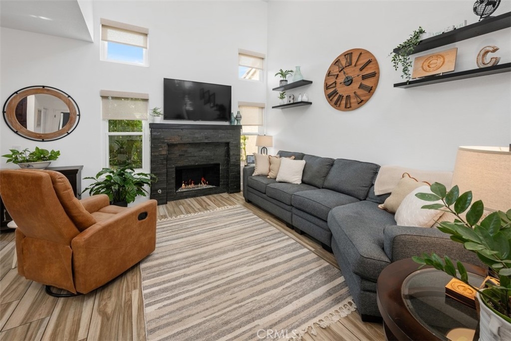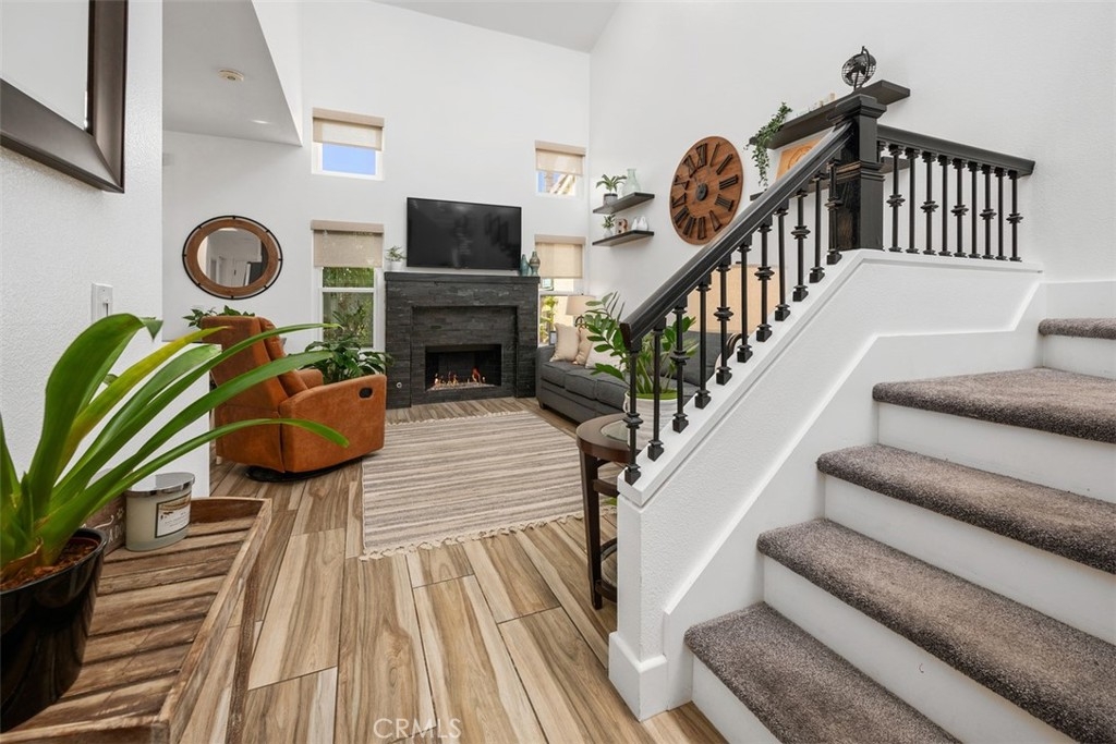 This beautifully upgraded 2 bed, 2.5 bath home is one of the finest in Sierra Verde. Backing to a small greenbelt, the enclosed yard offers privacy and peace. The inside was recently updated with flooring, carpet, and interior paint throughout. The kitchen has been fully remodeled as of 2025 with wood cabinetry, quartz counters and stainless steel appliances. Vaulted ceilings, a custom dark stone fireplace, dual-pane windows, and a combination of plantation shutters and automated curtains complete the inviting living space. A separate laundry room with washer/dryer is located opposite the downstairs hall bath. The master suite features a walk-in shower, quartz counters, and recessed lighting, while the second bedroom includes its own upgraded bath. The two-car garage has been upgraded with polished concrete floors, overhead and wall storage racks and a 220V electric vehicle plug. HOA recently replaced roof and skylight. A short walk across Arroyo Vista to the scenic Tijeras Creek trails. Close to parks, RSM Beach Club, and toll roads.