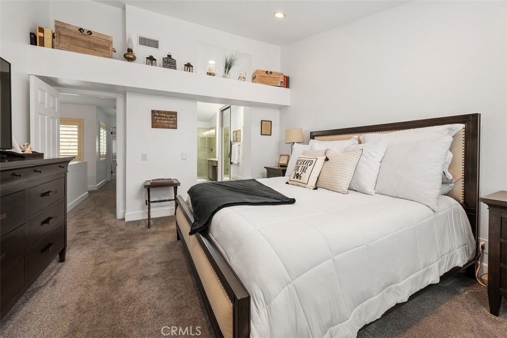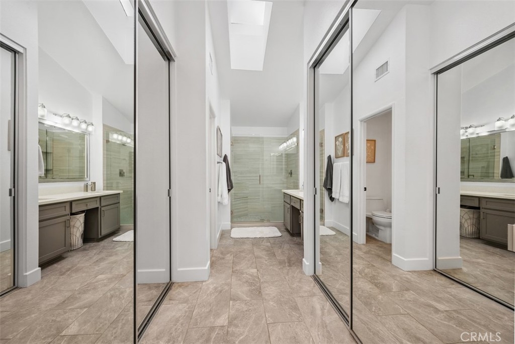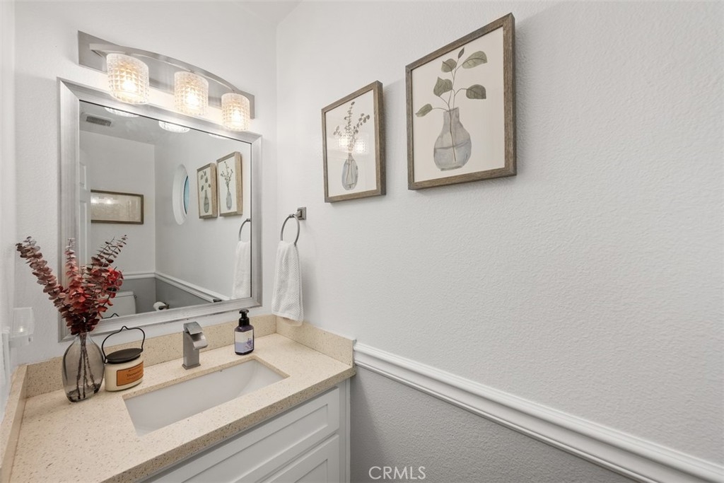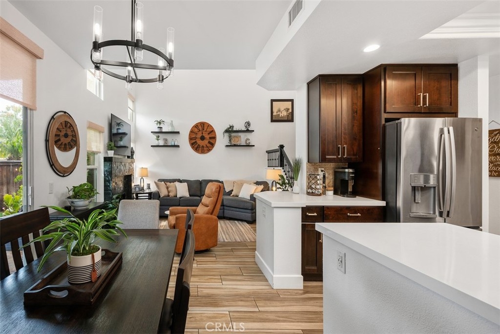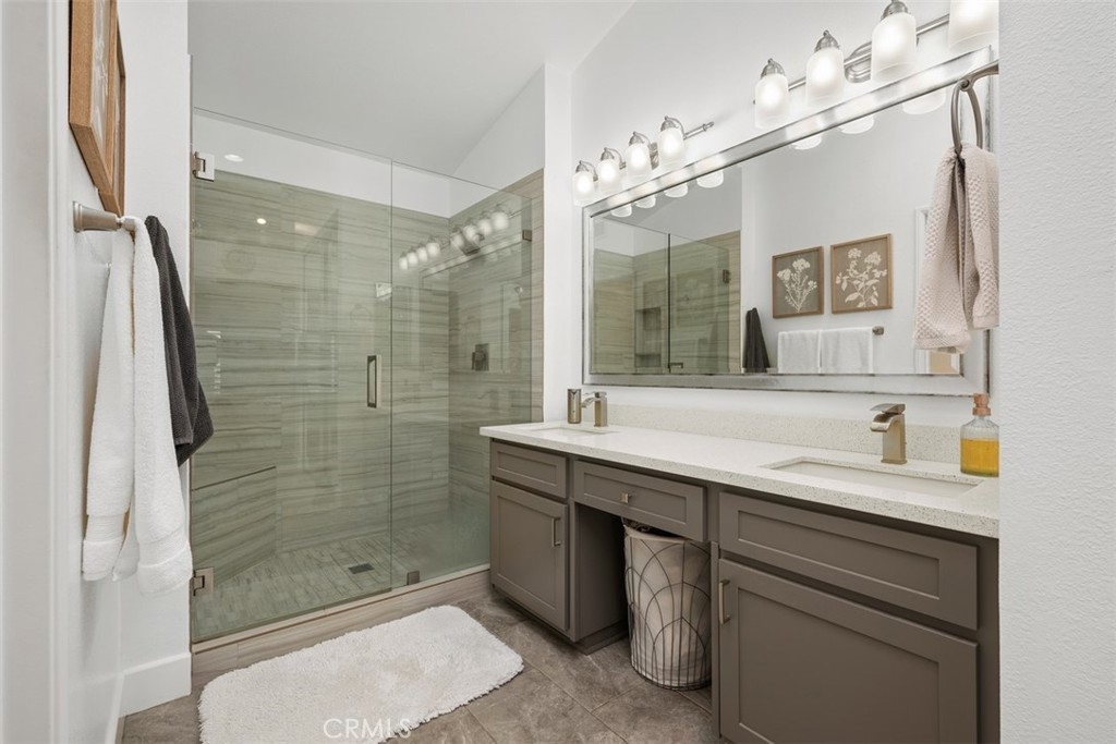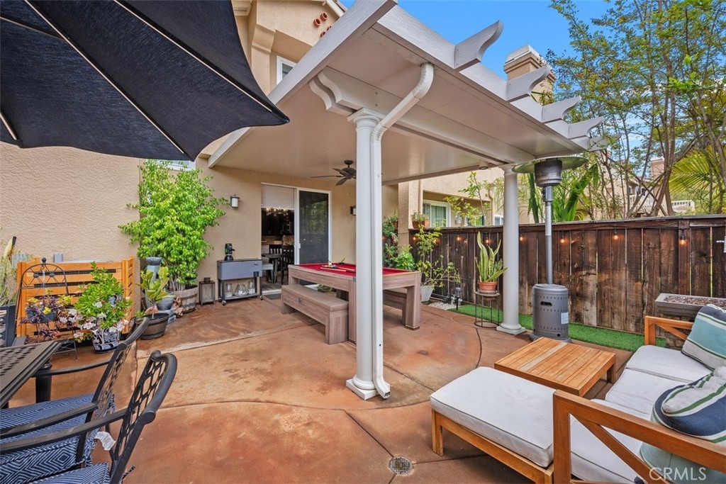 This beautifully upgraded 2 bed, 2.5 bath home is one of the finest in Sierra Verde. Backing to a small greenbelt, the enclosed yard offers privacy and peace. The inside was recently updated with flooring, carpet, and interior paint throughout. The kitchen has been fully remodeled as of 2025 with wood cabinetry, quartz counters and stainless steel appliances. Vaulted ceilings, a custom dark stone fireplace, dual-pane windows, and a combination of plantation shutters and automated curtains complete the inviting living space. A separate laundry room with washer/dryer is located opposite the downstairs hall bath. The master suite features a walk-in shower, quartz counters, and recessed lighting, while the second bedroom includes its own upgraded bath. The two-car garage has been upgraded with polished concrete floors, overhead and wall storage racks and a 220V electric vehicle plug. HOA recently replaced roof and skylight. A short walk across Arroyo Vista to the scenic Tijeras Creek trails. Close to parks, RSM Beach Club, and toll roads.