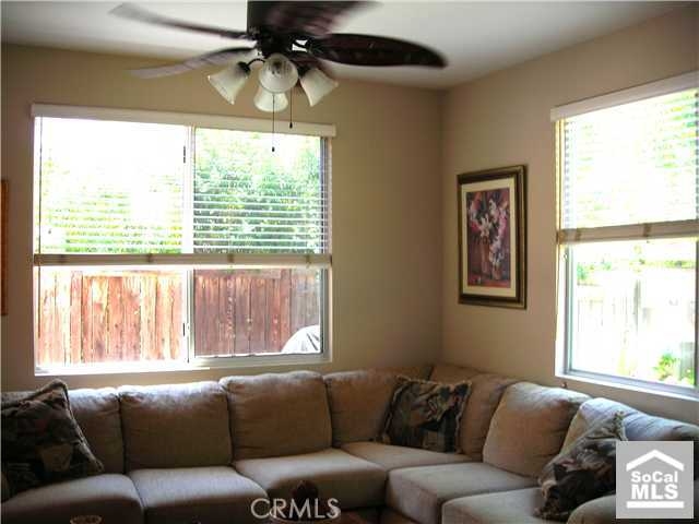 This is the lowest priced unit in the Los Abanicos Tract! It is a very charming unit with new carpet in living room, nice tile flooring downstairs, ceiling fans in each bedroom and in living area. White kitchen cabinets makes this space very light & bright. Large wrap around backyard with mexican pavers & grassy area. Two car attached garage with storage cabinets..refridgerator, washer & dryer included!