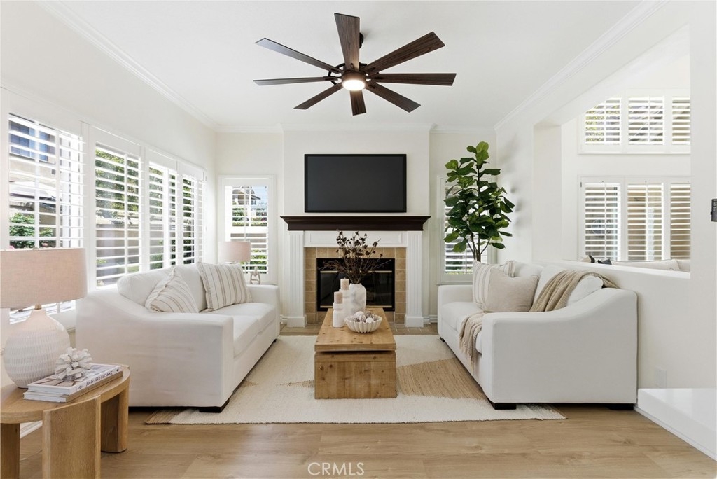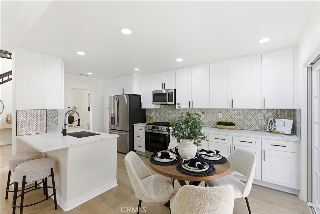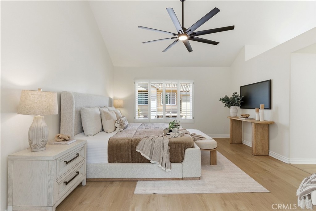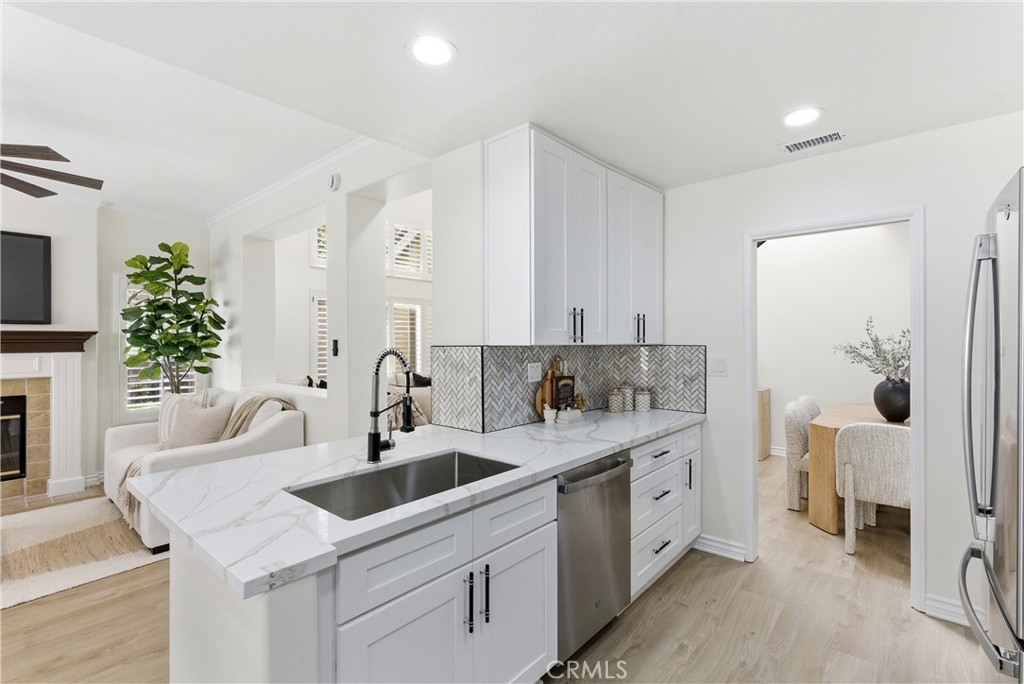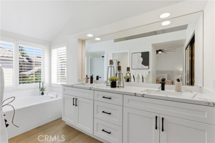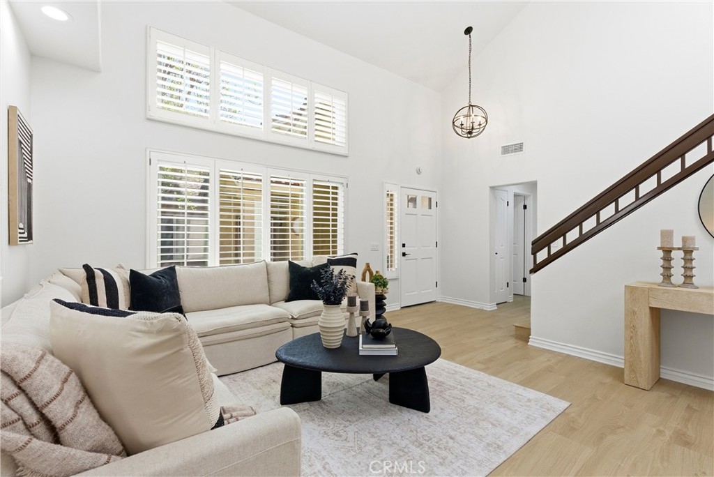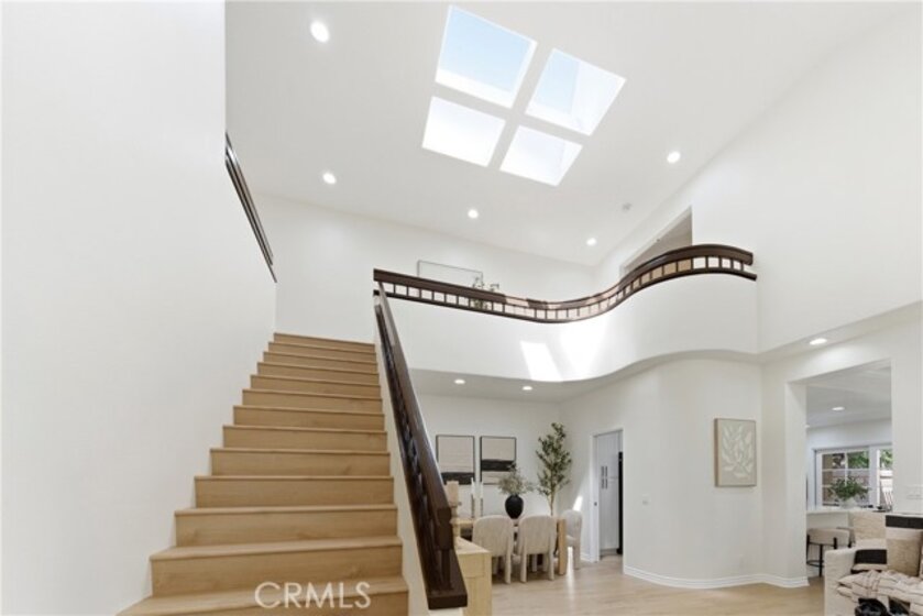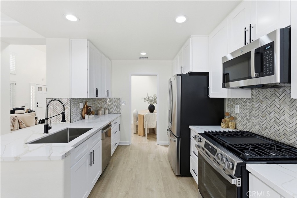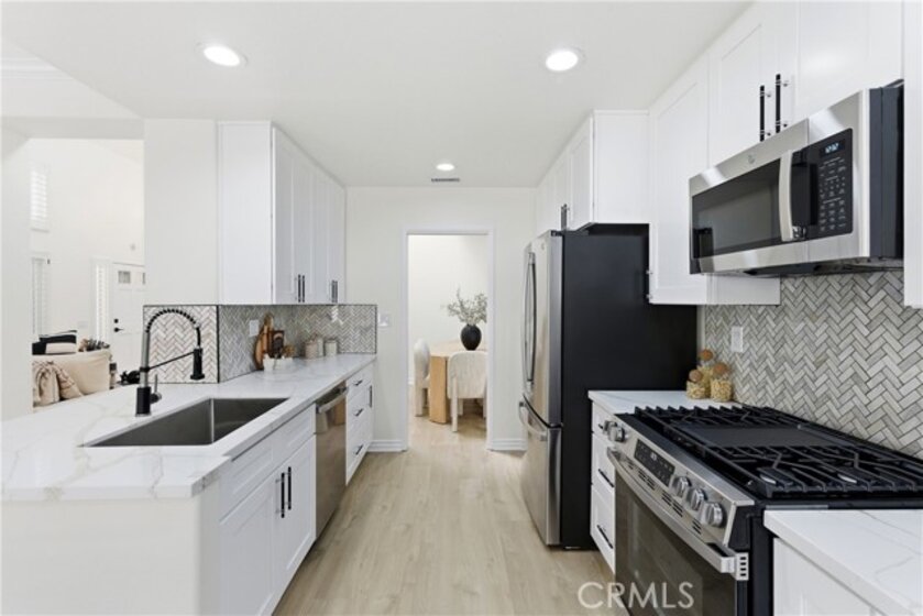 Welcome to your beautifully remodeled dream home in Rancho Santa Margarita! This stunning 3-bedroom, 2.5-bath residence offers the perfect blend of style, comfort, and functionality with a spacious open-concept layout designed for modern living and entertaining. From the moment you walk in, you’ll be impressed by soaring cathedral ceilings, a large skylight that fills the home with natural light, plantation shutters throughout, and a statement entry chandelier that sets the tone. The fully remodeled custom kitchen is a showstopper, featuring a herringbone backsplash, all-new GE appliances including a stainless refrigerator and freezer, gas range, built-in microwave, and dishwasher, plus a large stainless steel sink overlooking the main living area. The home also boasts remodeled bathrooms, including a spacious primary en suite, new lighting, ceiling fans throughout, and a generously sized primary bedroom with high ceilings. Secondary bedrooms offer built-in storage, with one featuring a large walk-in closet. Additional upgrades include energy-efficient vinyl windows and a newer A/C unit for year-round comfort. The home also features an attached, spacious 2-car garage with additional storage, providing both convenience and functionality. Step outside to your private backyard oasis, recently landscaped with lush flower beds, beautiful rose bushes, and a newer sprinkler system to keep everything vibrant. A covered patio provides the perfect balance of shade and natural light—ideal for relaxing or hosting guests. Plus, enjoy the added convenience of a community pool located directly across from the home, offering quick and easy access for everyday enjoyment. Enjoy all the benefits of being part of SAMLARC, with access to resort-style amenities including a private beach club, lagoon, pools, parks, sports courts, and scenic trails connected to Lago Santa Margarita. This home truly offers the best of indoor-outdoor living in a vibrant, amenity-rich community.