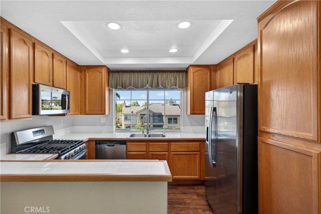 Turnkey upstairs condo with multiple balconies and resort-style amenities in the highly sought-after Tijeras Creek Villas of Rancho Santa Margarita. This light-filled home features soaring cathedral ceilings in the living room, creating an open and airy feel. The versatile floor plan includes a spacious primary suite and a secondary bedroom with direct access to the second bathroom, ideal for guests, roommates, or a home office setup. Enjoy seamless indoor-outdoor living with a wraparound balcony accessible from both the living room and primary bedroom, plus a second private balcony off the secondary bedroom—perfect for relaxing or entertaining. The interior is thoughtfully updated with luxury vinyl plank flooring, new carpeting, central air and heat, and a cozy gas fireplace. The kitchen offers stainless steel appliances, and the in-unit laundry adds everyday convenience. Parking is a rare bonus with a private one-car garage, assigned carport, and ample guest parking, allowing for up to three total spaces. Residents enjoy access to two pools and spas, a fitness center with sauna, BBQ areas, playgrounds, and beautifully maintained greenbelts. Ownership includes SAMLARC membership, offering access to Lago Santa Margarita, the Beach Club Lagoon, multiple pools, parks, sports courts, scenic trails, and year-round community events. An incredible opportunity to own in one of South Orange County’s most amenity-rich communities.
