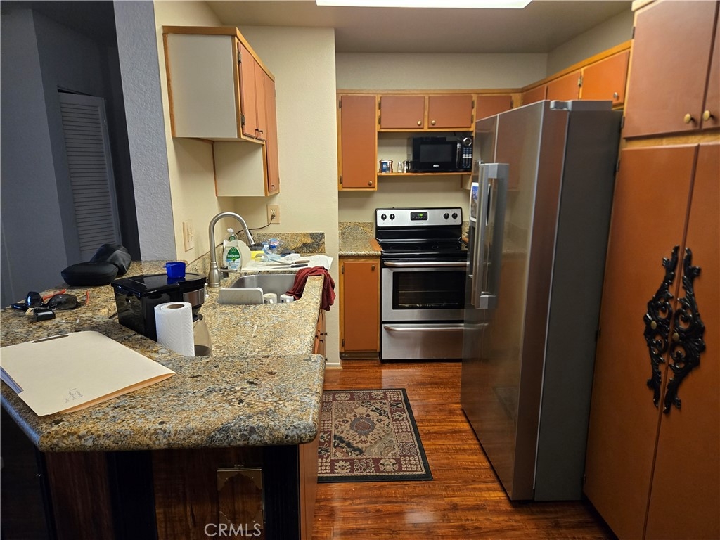 Lovely ground level condo with wood flooring throughout. Owner has remodeled this lovely condo including new interior paint and kitchen cabinet doors. As you enter the front yard portion you are impressed by the number of plants and trees that are thriving in the court yard all large boxes that can be easily moved around with a hand truck, thereby giving the new owner many options regarding which plants and where to locate them. All of the fencing has been replaced with newer vinyl style white fencing giving the courtyard a clean look. The garage is just a few steps from the front door and it has some shelves that the owner has built in for storage as well as the standard garage door opener. The owner has replaced all of the interior flooring with wood planks and it looks great. The kitchen has all newer appliances and they will all be included in the sale. This will make a great deal for a first time buyer.