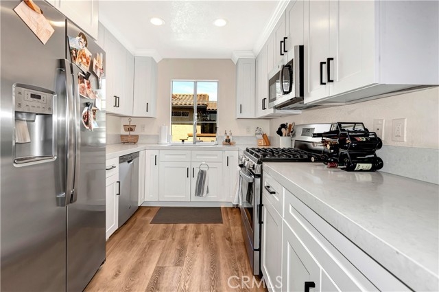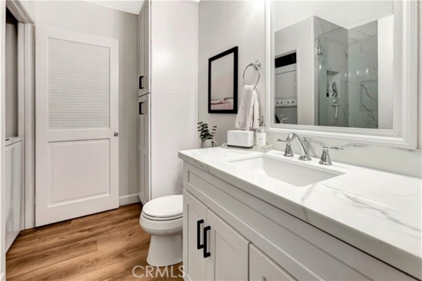 Completely remodeled w/expansive views of Golf Course, Lake, Fountain and Waterfall from Tijeras Creek Golf course! Home also offers an assumable FHA loan at 2.875% to qualified buyers! Call LA for details! Views can be enjoyed from Living room, patio and master bedroom. This upstairs 2 BR 2 BA has tasteful luxury vinyl plank flooring throughout, remodeled bathrooms with marble tile shower/tubs, white wood cabinets, quartz-look vanity tops, and black hardware. Kitchen was also recently remodeled with white wood cabinets, farm sink, quartz counter tops, and stainless steel appliances. Laundry closet with stacked Washer/dryer. Both bedrooms have built-in closet organizers, wood blinds. Other features are quartz-look marble faced fireplace, volume ceilings, and 1 car garage plus carport for parking. Tijeras creek villas has 2 pools and a gym, while Rancho Santa Margarita offers numerous community parks, pools, and Lake. Check those amenities out at www.SAMLARC.com