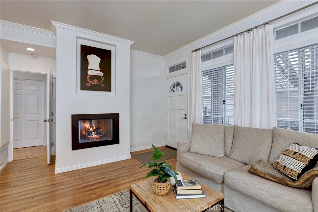 Welcome to this charming one bedroom, one bathroom remodeled LOWER unit condo located in the peaceful Belflora community in the heart of Rancho Santa Margarita. As you walk up to the home, you are greeted with an inviting enclosed front patio, perfect for enjoying a morning coffee or an evening refreshment. Inside, you'll find a spacious living room complete with a cozy fireplace, perfect for relaxing after a long day. Adjoining the living area is a beautifully updated kitchen with all white cabinetry, stunning Corian countertops, recessed lighting and a dining area. The primary bedroom is so light and bright and is HUGE. The remodeled bathroom features dual sinks, modern walk-in shower and a spacious walk-in closet, providing plenty of storage space. Other amenities include updated laminate flooring, fresh paint, crown molding, a tankless water heater and a covered carport just steps away from your front door. Enjoy the Belflora community pool and spa as well as all of the Rancho Santa Margarita City amenities. This amazing location allows you to walk to shops, restaurants, and more, making it the perfect place to call home!