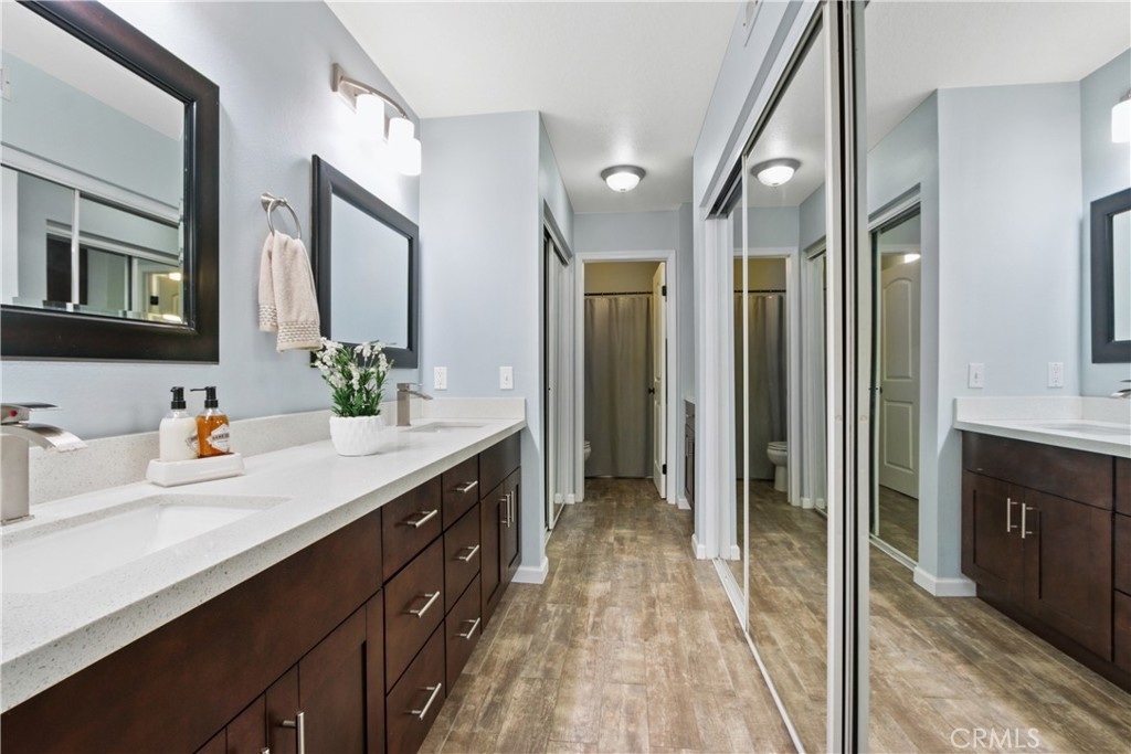 This terrific upper level end-unit condo is the perfect place to call home! Enjoy a spacious primary bedroom which includes a beautiful bath with a quartz dual sink vanity, a privacy door to the toilet and shower area as well as a wall of mirrored closets with tons of storage. A secondary bedroom is located down the hallway from the lovely guest bath and includes a shower. Prepare meals from a lovely kitchen with quartz counters, stainless steel appliances, updated lighting, and a mosaic glass tile backsplash and savor the meal in a separate dining area. Entertain or just relax in the generous-sized living room which has vaulted ceilings. Laminate wood floors though out the main living area and nicely tiled bathroom floors. Enjoy a book and a glass of wine on the lovely deck located off the living room. The deck provides a private, tree-house affect with lovely shade trees. For your convenience there is an inside laundry and an attached, direct access stairway to the single-car garage. A detached carport is also provided. Located close to shopping, restaurants, hiking trails. Don’t miss out on all this wonderful community has to offer and RSM amenities. NO Mello Roos!