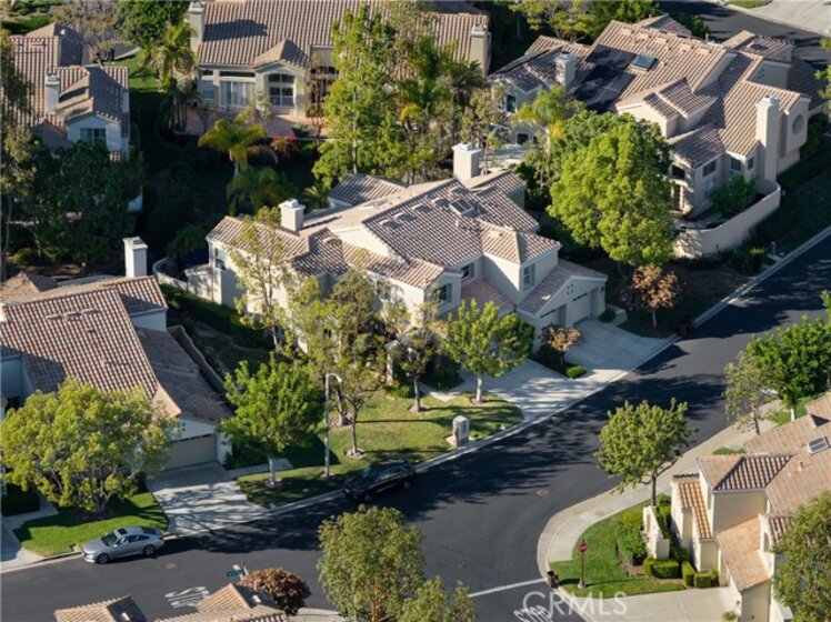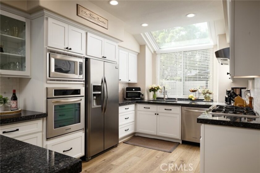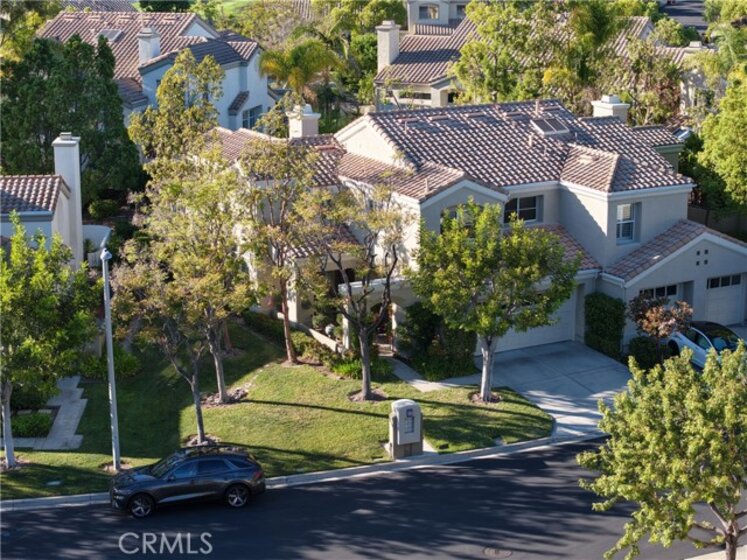 Located in the desirable Alicante Tract!! A Tijeras Creek Golf Course neighborhood! This stunning, beautifully upgraded home offers a warm and inviting layout with a dramatic front entry and open living spaces enhanced by vaulted ceilings and beautiful vinyl flooring. The kitchen, truly the heart of the home, features granite countertops, custom-painted cabinetry, stainless steel appliances, under-cabinet lighting, a stovetop, and solarium windows, and flows seamlessly into the light-filled family room with abundant natural light. The living and dining room showcase a vaulted ceiling, plantation shutters, a skylight, and a striking fireplace with custom tile and mantle. The spacious primary bedroom includes custom paint, a vaulted ceiling, and a large walk-in closet. The primary bathroom is elegantly upgraded with a Restoration Hardware vanity, Crema Marfil marble, custom tile, and a shower with a tumbled marble enclosure, tile inlay, and seamless glass door. Upstairs also features two additional bedrooms and an upgraded guest bathroom. The main level offers a beautifully upgraded guest bathroom along with a dedicated laundry room. Step outside to a private backyard retreat with hardscape and lush tropical landscaping, perfect for relaxing or entertaining. Additional features include a two car attached garage with a driveway. Residents enjoy the Alicante Association pool and spa along with Rancho Santa Margarita’s amenities, including parks, pools, the lake, tennis courts, community events and more!!.