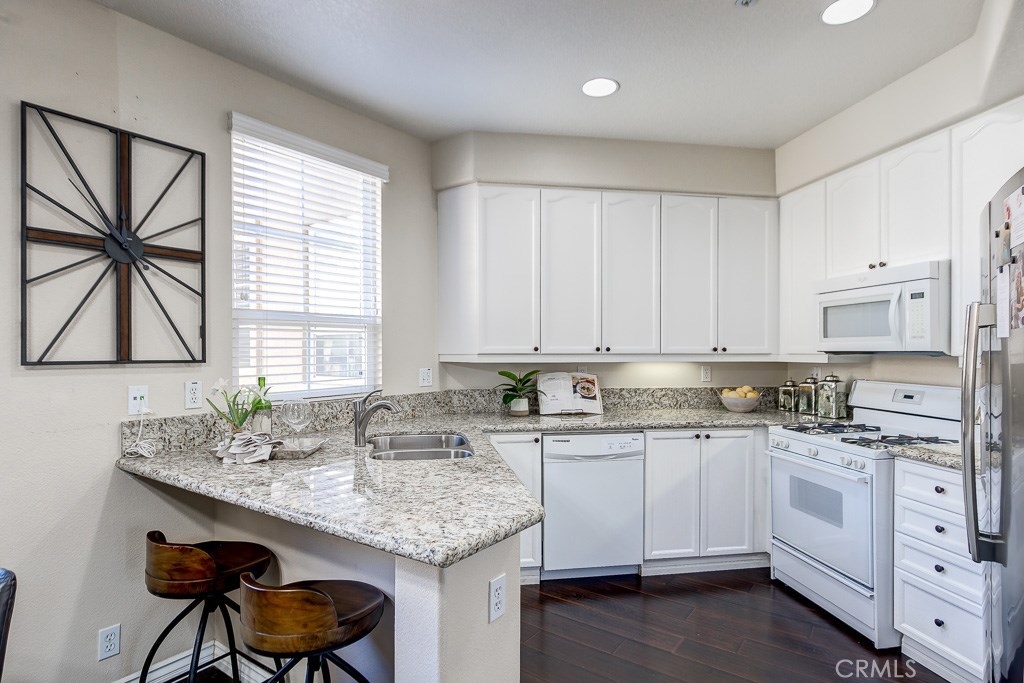 This charming home in the sought after community of Corte Molina will speak to you immediately. Gorgeous wood flooring sweeps through the entire main floor, perfectly anchoring the space. Prepare a meal for friends or loved ones in your beautiful kitchen with white cabinets and light granite counters. A perfectly sized dining area gives the opportunity for formal meals or the breakfast bar is ready for a snack too! On those cooler nights cozy up by your fireplace, or relax with a movie on any occasion. At the end of the day, your master bedroom is spacious and peaceful, with large sliders out to a lovely balcony. Downstairs you will find an extra bedroom, a laundry space and direct access to your one car garage. It's good to be Home!