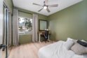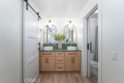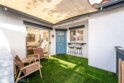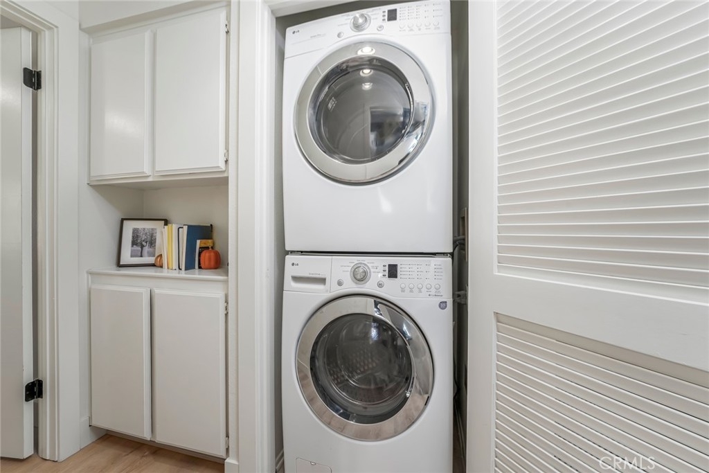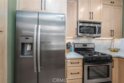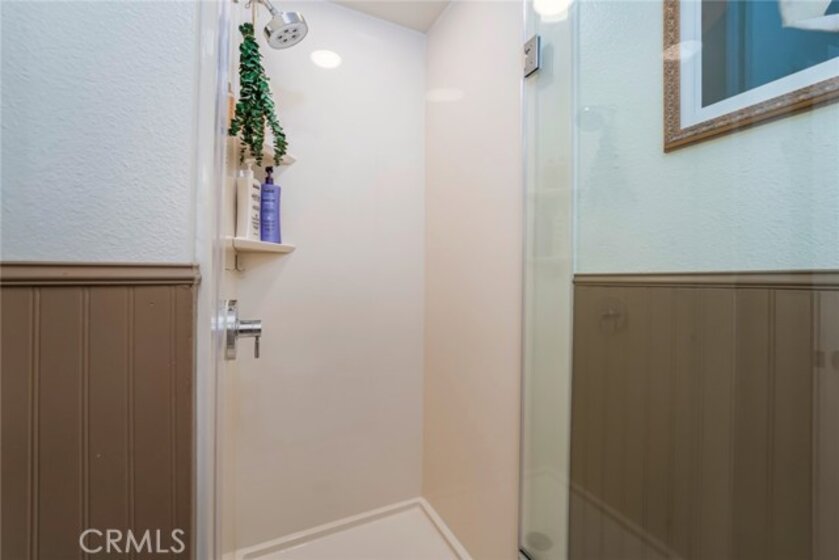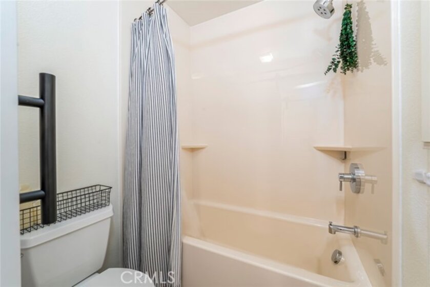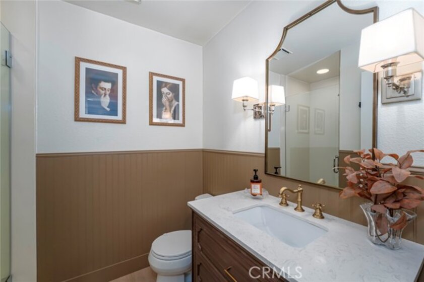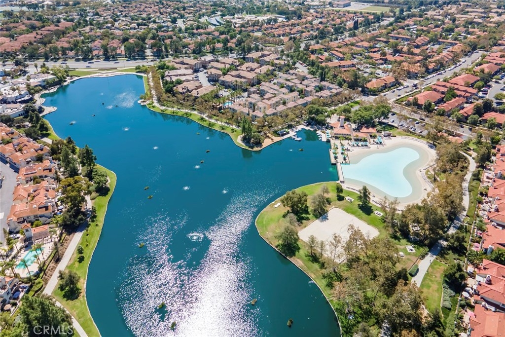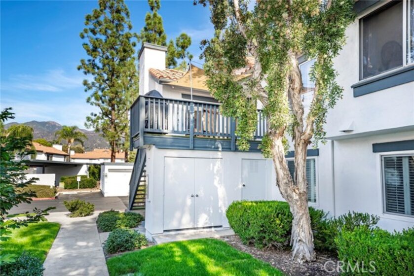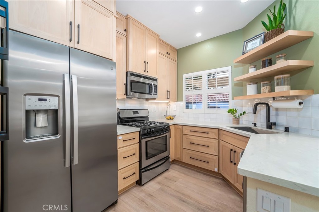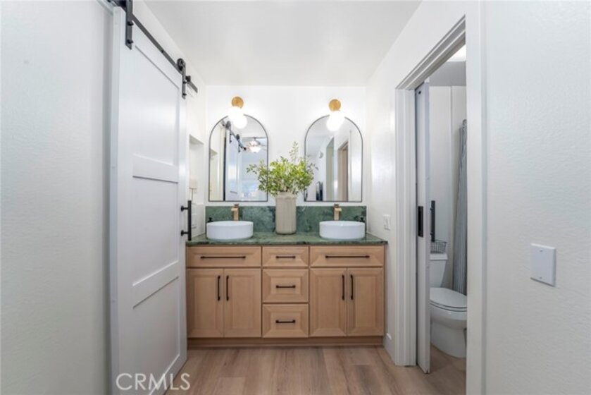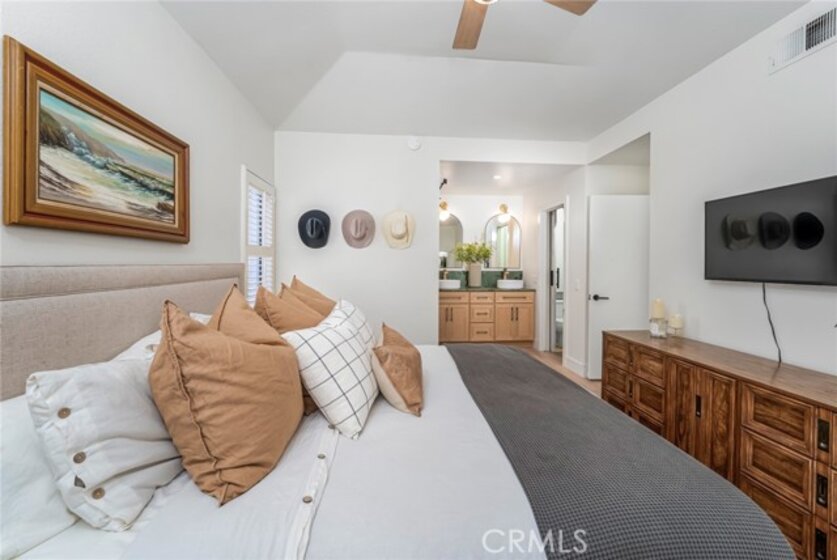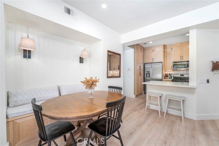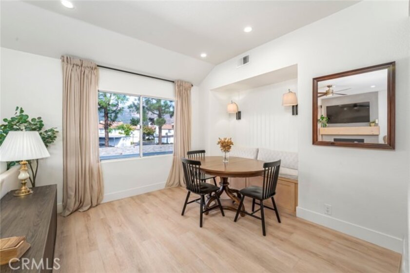 Welcome to this beautifully upgraded upper-level corner condo in the desirable Brisa Del Lago II community. With soaring vaulted ceilings and an open-concept layout, this home is bathed in natural light, creating a warm and inviting atmosphere. The newly remodeled kitchen is a showstopper—featuring quartz countertops, a custom tile backsplash, stainless steel appliances, floating shelves, and extended ceiling-height cabinetry. A removed wall and raised ceiling enhance the sense of space, while a window near the sink brings in even more light. The kitchen flows seamlessly into the dining area, perfect for entertaining. Luxury vinyl plank flooring runs throughout the entire living areas, complementing the cozy fireplace and ceiling fan in the spacious living room. Step through the sliding glass door to a private balcony with turf—ideal for relaxing or enjoying your morning coffee. The dining area boasts custom built-in bench seating with storage and designer lighting. Both bedrooms include ceiling fans, with the primary suite offering a walk-in closet with stylish barn doors and a fully updated ensuite bath featuring a new fiberglass tub/shower combo, dual vanities with quartz counters, and modern vessel sinks. The secondary bedroom, currently used as an office, includes a mirrored wardrobe and easy access to a second updated full bath. Additional highlights include an in-unit stackable washer and dryer, a detached one-car garage with opener, and access to the community pool, spa, and recreation area. Located just moments from Rancho Santa Margarita Lake, Trabuco Mesa Park, Monte Vista Park, and O’Neill Regional Park—with year-round events, shopping, dining, and entertainment nearby—this home offers the perfect blend of comfort, style, and convenience.