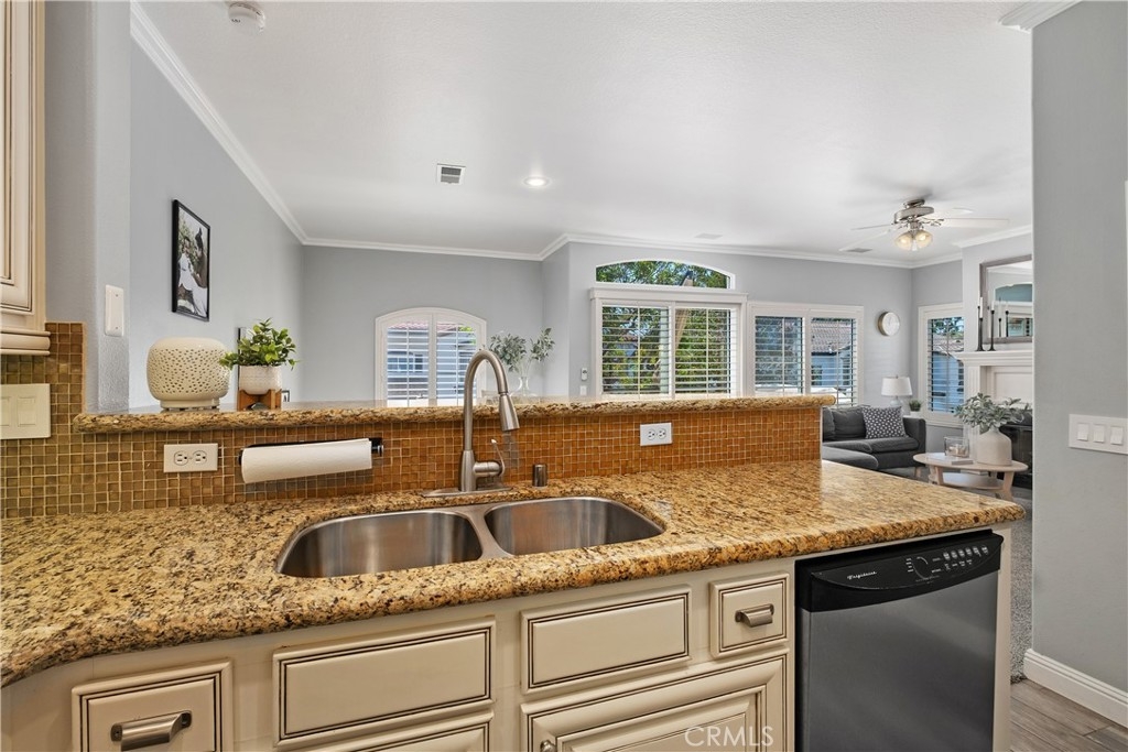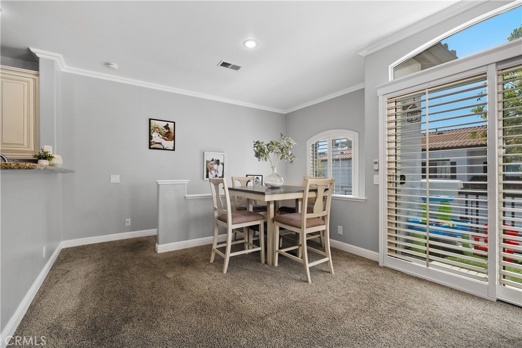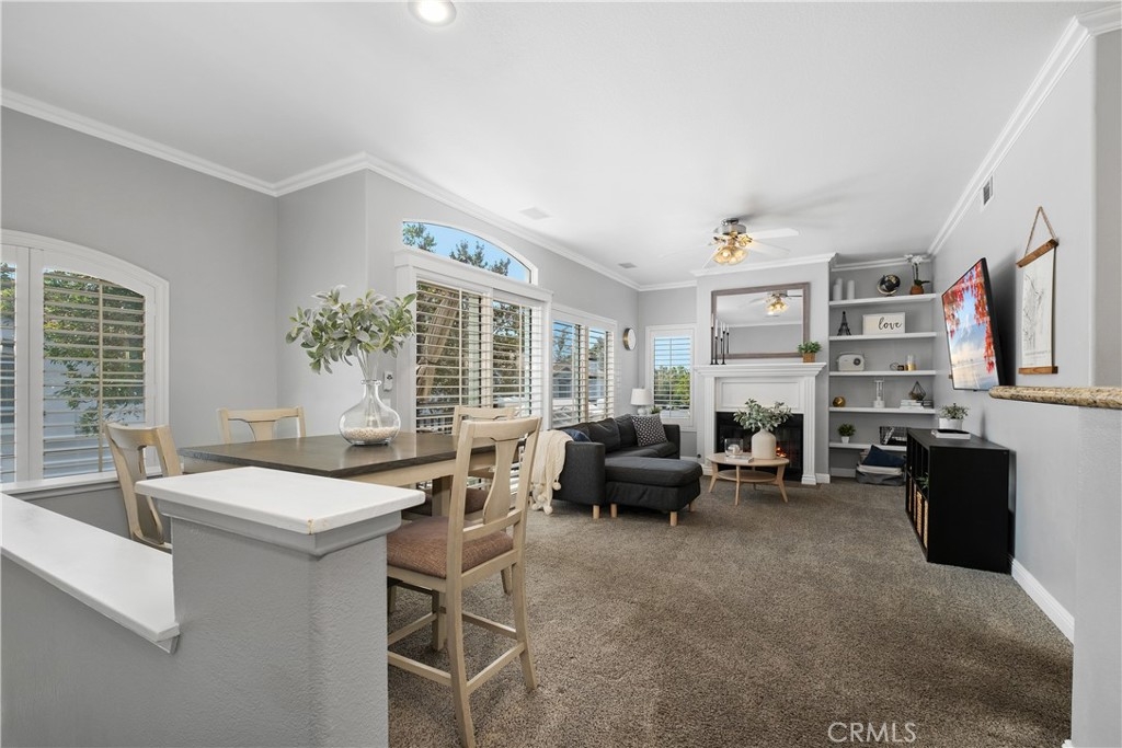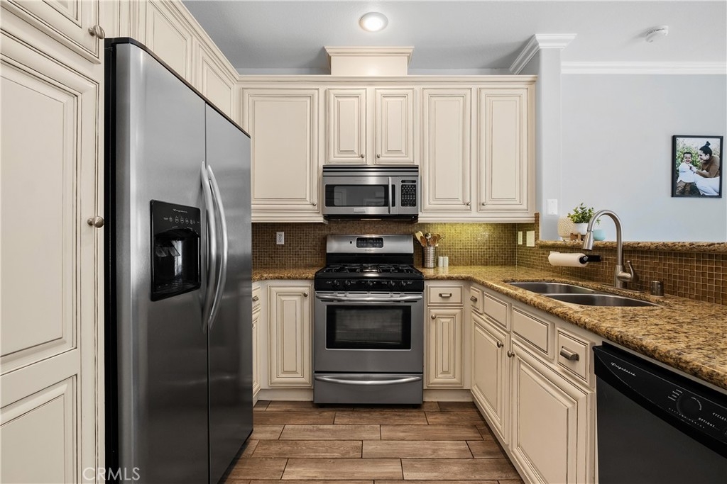 Welcome to this charming 2-bedroom, 2-bathroom end-unit condo that’s all about comfort and convenience—plus, it’s perched up high like a cozy treehouse (but better). This carriage unit sits above the garages, so you’ve got no one above or below you. It’s the perfect retreat for anyone who loves peace and privacy. Start your day by heading to your oversized one-car garage with direct access, epoxy-coated floors (because your car deserves a smooth, shiny ride), and your very own laundry station. Oh, and there's also an assigned parking spot right outside your front door. Because who has time for parking drama? Plus, there's a car charger in the garage, so you’re all set for your electric ride. Inside, you’ll find custom shutters, crown molding, and wood-look porcelain tile flooring throughout the main areas (because your feet deserve something stylish). Step up to the open-concept living space, where natural light floods in through large windows, highlighting a cozy fireplace with an upgraded mantel that’ll make you feel all warm and fuzzy inside. The kitchen? Granite counters, light cabinets, and sleek stainless appliances—perfect for whipping up anything from gourmet meals to frozen pizza (no judgment here). Step outside through the sliders in the living room to a spacious tiled patio—ideal for relaxing, entertaining, or just soaking up some sunshine. Down the hall, you’ll find a generous linen cabinet and a primary bedroom with high ceilings and an en-suite bath featuring updated mirrors, a dual vanity, and not one, but TWO closets with shelving. The second bedroom is equally charming, and right across the hall is the updated secondary bathroom with a fresh vanity and mirror. Extras? You bet. Ceiling fans in every room, plus a brand new water heater in the garage (because who likes a cold shower?). The community recently got a fresh coat of paint, and there are no exterior stairs—so no awkward tripping on your way to the front door. With just a short walk to a park that’s basically a playground paradise: volleyball courts, tennis courts, BBQs, covered tables for hosting guests, and walking trails with views that go on forever. You’re also close to all the best things in Rancho Santa Margarita, from the lake to the golf course, shopping, dining, and all the essentials like Trader Joe’s, Target, and Cinepolis. Plus, NO Mello Roos and LOW taxes—this is the good stuff, folks. So what are you waiting for? It’s a great place to call home!