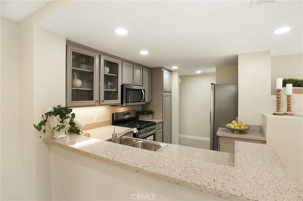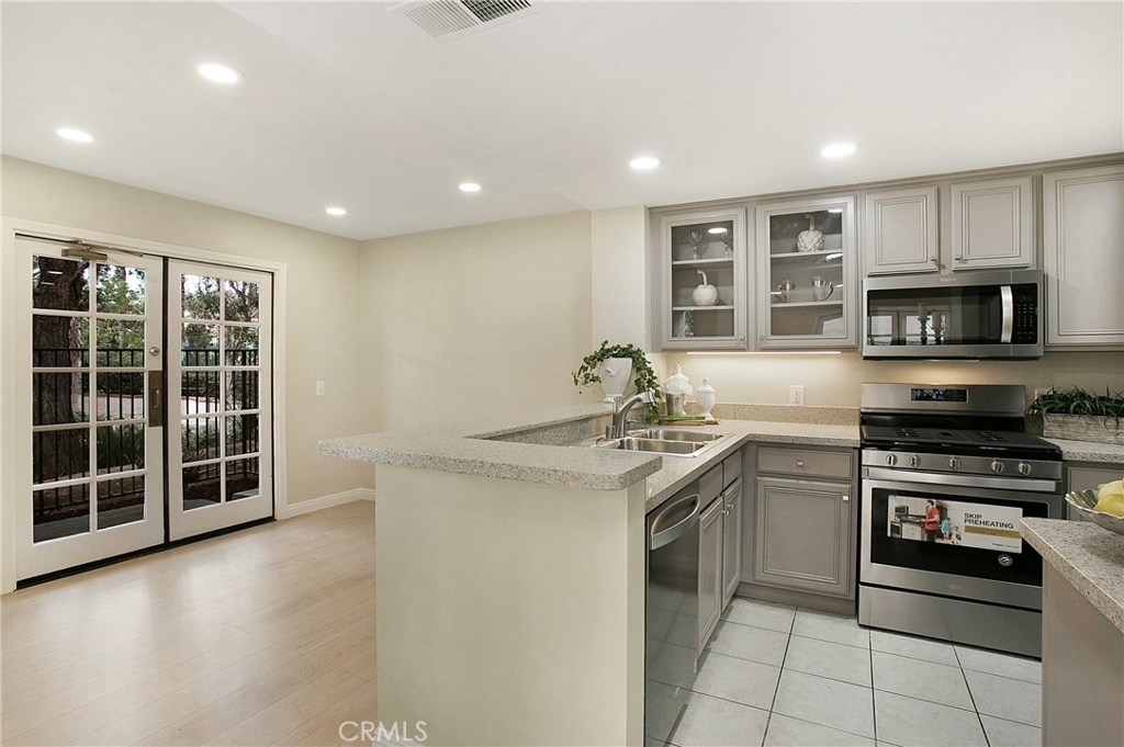 Light and Bright 2 bedroom 2 bath condominium with 4 patios! This corner unit was a former model and includes 2 sets of custom french doors and awnings not found in other units. Remodeled kitchen with custom cabinets, new stainless appliances including 5 burner gas range and refrigerator. Remodeled baths with double vanity and separate tub and shower in the master. Both large bedrooms have mirror wardrobe doors with his and her closets in the master. Other upgrades include new laminate flooring, LED recessed lighting, new fixtures, door hardware and upgraded baseboards throughout. Freshly painted attached garage plus a reserved parking space conveniently located just outside. Member of SAMLARC with pools, tennis courts, parks, picnic areas, boat rentals, beach club and a splash pad water park coming soon! walking distance to hiking and biking trails and park with tot lot, tennis, sand volleyball and picnic areas. Highly rated award winning schools. Centrally located near shopping, cinemas, restaurants and the 241 toll road. LOW HOA!