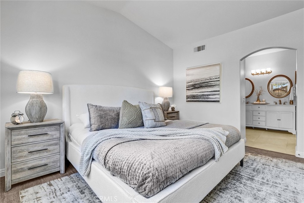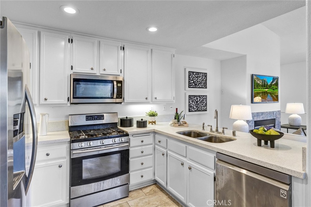 Welcome to the desirable neighborhood of Tierra Montanosa of Rancho Santa Margarita. This beautiful, turnkey end-unit carriage unit condo offers 2 upstairs bedrooms and 2 full bathrooms with an inviting open floor plan, soaring ceilings, and abundant natural light throughout with approximately 1,100 square feet of living space. The spacious living room features a cozy fireplace and opens to a lovely, oversized balcony perfect for relaxing. The modern kitchen is equipped with quartz countertops and stainless-steel appliances. The generous primary suite includes walk-in closet, new dual-sink vanity, and quartz countertops. Other upgrades include dual pane windows, recessed lights, ceiling fans, vinyl flooring, fresh neutral paint, custom bathroom lighting, and more. The attached garage offers direct entry into the home, and a reserved parking space is also included. Enjoy the convenient location within a short walk to Melinda Heights Elementary, O’Neil Regional Park, sports courts, hiking and biking trails, shopping, and dining, within easy reach of Highway 241. Residents enjoy access to a variety of amenities, including resort style swimming pool/spa, Beach Club, play areas, summer concerts, and access to Rancho Santa Margarita Lake. It offers the perfect balance of luxury, convenience, and lifestyle. Don’t miss the chance to make this stunning property your own!
